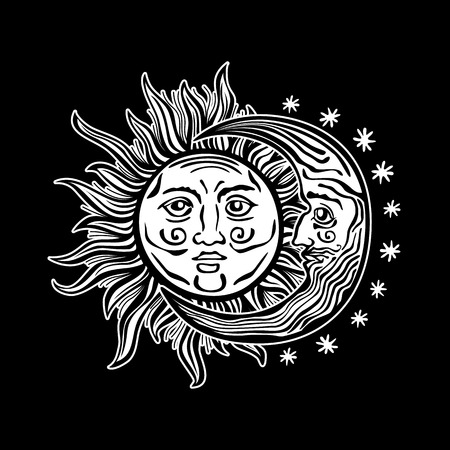 太陽と月 そして人間の顔でスターのエッチング スタイル漫画イラスト 概要は 簡単な再着色の背景が透明な固体黒です のイラスト素材 ベクタ Image