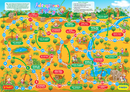 子供のためのボードゲームのベクトル イラスト メアリーの冒険 ジャングルの中で旅行ですか 一緒にメアリーと新しいお友達 のイラスト素材 ベクタ Image